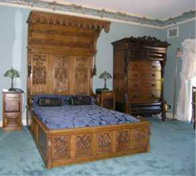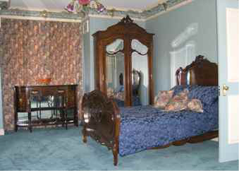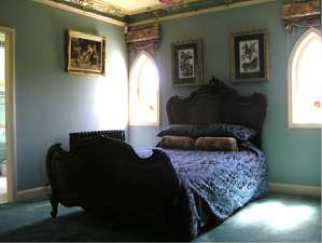 The French Room overlooks the rear grounds of The Castle with tranquil pond and wooded area. The French Room features an antique French bed from the nineteenth century, a beautiful Armoire, a marble topped Credenza, and of course its own self contained luxury ensuite bathroom with claw foot bath and shower.