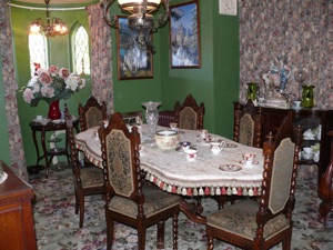 The dining room can seat up to eight people. Featuring an antique, carved dining table, this room provides a wonderful ambience for enjoying a relaxed, home-cooked meal.